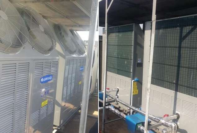 本工程采用格力智能全自动空气能热泵热水机组并联连网运行方式,单台主机的热效率为9.47KW,且其振动小、噪音低。为保证主机运行通风换热良好将其安装于天面上